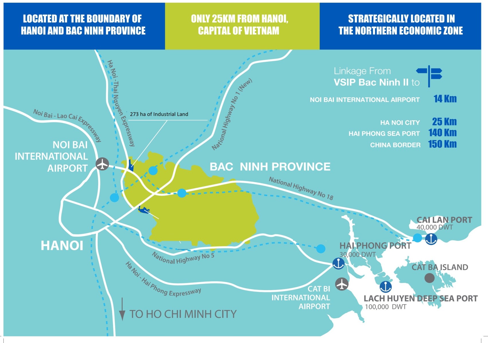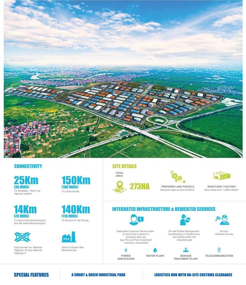 Province: Thai Nguyen, Northern Vietnam Total area: 296 ha Operating timeline: 2024–2074 Land structure: Zone 1 (175 ha) and Zone 2 (121 ha) Leasing model: industrial land for lease under an infrastructure-ready model
