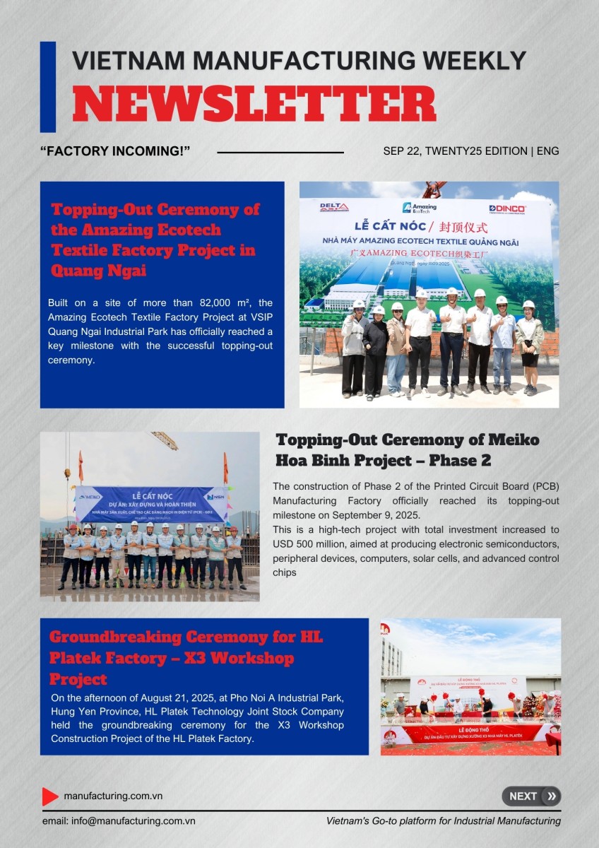 Vietnam Manufacturing Weekly is your reliable, 5-minute-read briefing on key movements shaping Vietnam’s industrial landscape. Each issue highlights “Incoming Factories”, new industrial real estate projects, policy updates, logistics movements, and key opportunities for Manufacturers, Buyers, Service providers, and Industrial park developers. Designed for busy professionals, it delivers verified insights in minutes—helping you stay ahead, spot opportunities, and make informed decisions in Vietnam’s fast-moving industrial sector.